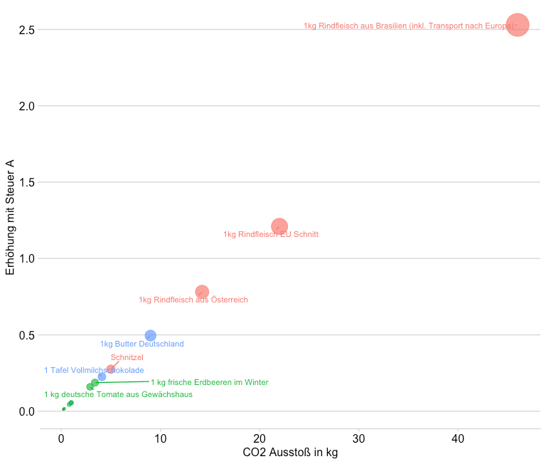 CO2 emissions in kg as well as potential price increases in case of a carbon tax of 55€/tonne for a selection of products. The sources can be found here. Color = lifestyle (vegan, vegetarian, eating meat), size = co2 emissions in kg.